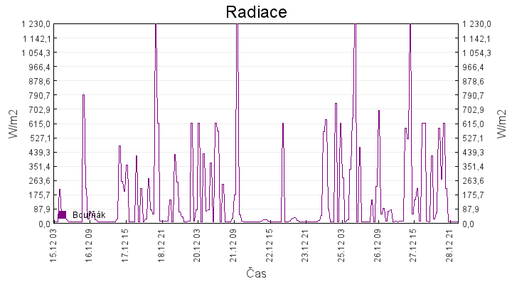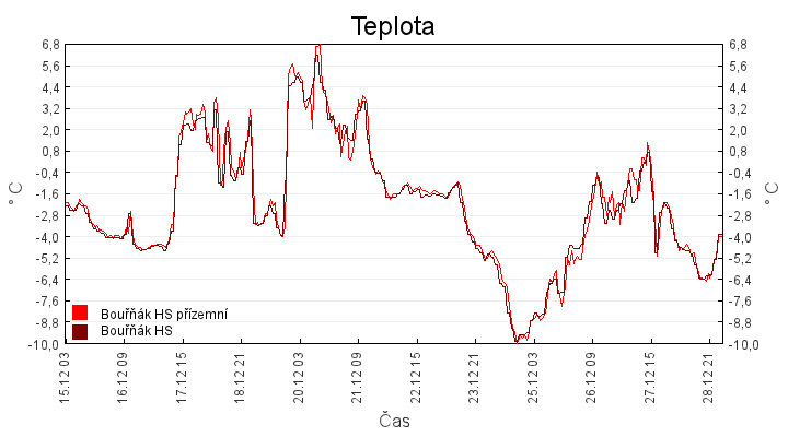 Aktuální hodnoty:Bouřňák HS (850 m): Datum: 29.12.2025 Čas: 01:20:00 Teplota: -4.99 °C Rychlost větru: 6.5 m/s Směr větru: 295.0 ° Radiace: 416.0 W/m2 Srážky 1h: 0.0 mm Srážky 24h: 0.0 mm Bouřňák HS (přízemní teplota) (850 m): Datum: 29.12.2025 Čas: 01:28:54 Teplota: -5.37 °C | Informace z Cínovce: Cínovec Předpověď počasí pro Bouřňák