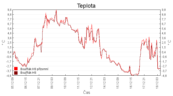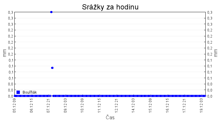 Aktuální hodnoty:Bouřňák HS (850 m): Datum: 19.12.2025 Čas: 08:20:00 Teplota: -3.34 °C Rychlost větru: 1.3 m/s Směr větru: 102.0 ° Radiace: 819.0 W/m2 Srážky 1h: 0.0 mm Srážky 24h: 0.0 mm Bouřňák HS (přízemní teplota) (850 m): Datum: 19.12.2025 Čas: 08:21:05 Teplota: -3.31 °C | Informace z Cínovce: Cínovec Předpověď počasí pro Bouřňák