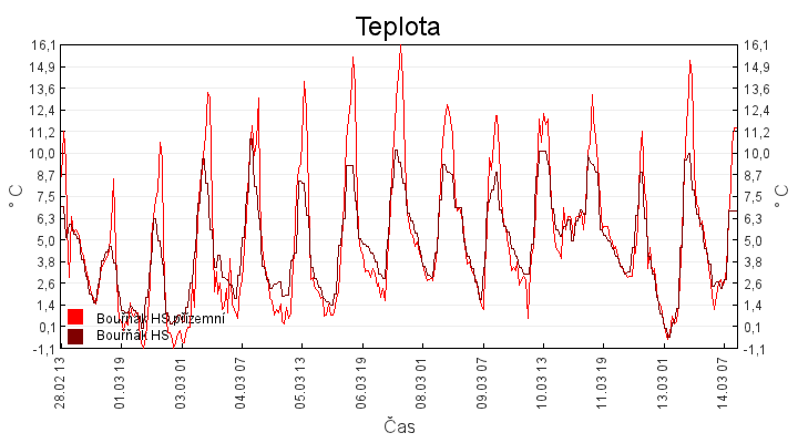 Aktuální hodnoty:Bouřňák HS (850 m): Datum: 08.12.2025 Čas: 15:00:00 Teplota: 7.80 °C Rychlost větru: 3.2 m/s Směr větru: 267.0 ° Radiace: 37.0 W/m2 Srážky 1h: 0.0 mm Srážky 24h: 3.1 mm Bouřňák HS (přízemní teplota) (850 m): Datum: 08.12.2025 Čas: 15:11:01 Teplota: 8.25 °C | Informace z Cínovce: Cínovec Předpověď počasí pro Bouřňák