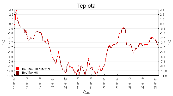 Aktuální hodnoty:Bouřňák HS (850 m): Datum: 29.01.2026 Čas: 06:00:00 Teplota: -4.19 °C Rychlost větru: 0.0 m/s Směr větru: 0.0 ° Radiace: 213.0 W/m2 Srážky 1h: 0.0 mm Srážky 24h: 0.2 mm Bouřňák HS (přízemní teplota) (850 m): Datum: 29.01.2026 Čas: 06:10:43 Teplota: -4.00 °C | Informace z Cínovce: Cínovec Předpověď počasí pro Bouřňák