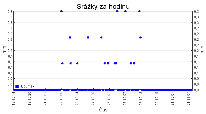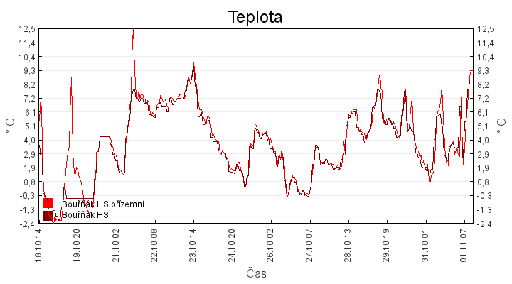 Aktuální hodnoty:Bouřňák HS (850 m): Datum: 01.11.2025 Čas: 05:19:00 Teplota: 5.34 °C Rychlost větru: 1.1 m/s Směr větru: 198.0 ° Radiace: 30.0 W/m2 Srážky 1h: 0.0 mm Srážky 24h: 0.0 mm Bouřňák HS (přízemní teplota) (850 m): Datum: 01.11.2025 Čas: 05:27:04 Teplota: 3.94 °C | Informace z Cínovce: Cínovec Předpověď počasí pro Bouřňák