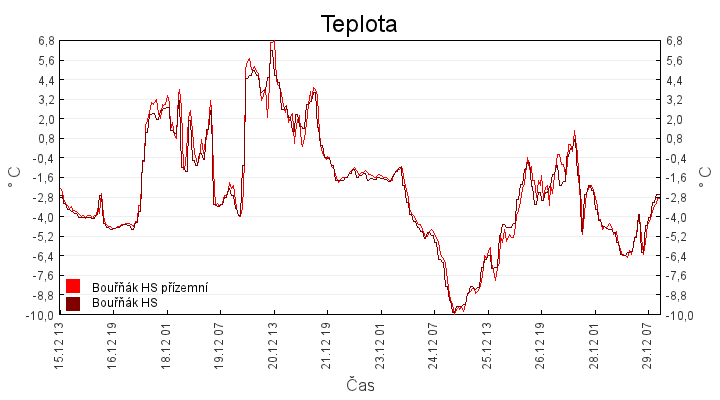 Aktuální hodnoty:Bouřňák HS (850 m): Datum: 29.12.2025 Čas: 11:30:00 Teplota: -3.15 °C Rychlost větru: 6.7 m/s Směr větru: 237.0 ° Radiace: 153.0 W/m2 Srážky 1h: 0.0 mm Srážky 24h: 0.0 mm Bouřňák HS (přízemní teplota) (850 m): Datum: 29.12.2025 Čas: 11:36:53 Teplota: -3.25 °C | Informace z Cínovce: Cínovec Předpověď počasí pro Bouřňák