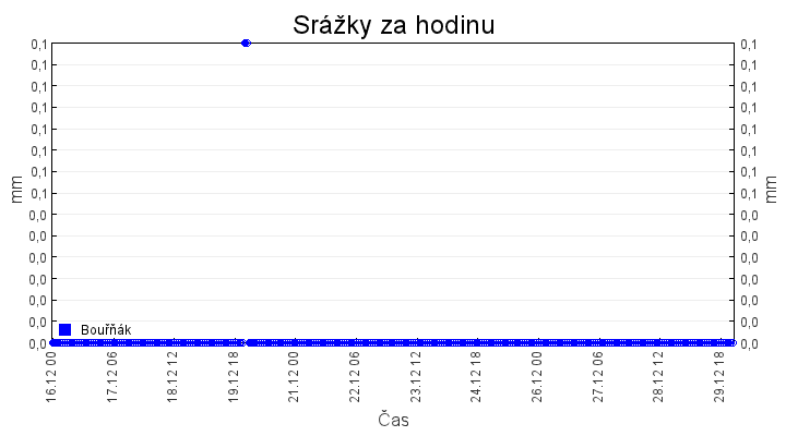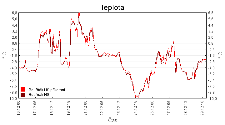 Aktuální hodnoty:Bouřňák HS (850 m): Datum: 29.12.2025 Čas: 22:30:00 Teplota: -2.54 °C Rychlost větru: 6.5 m/s Směr větru: 320.0 ° Radiace: 10.0 W/m2 Srážky 1h: 0.0 mm Srážky 24h: 0.0 mm Bouřňák HS (přízemní teplota) (850 m): Datum: 29.12.2025 Čas: 22:37:52 Teplota: -2.56 °C | Informace z Cínovce: Cínovec Předpověď počasí pro Bouřňák