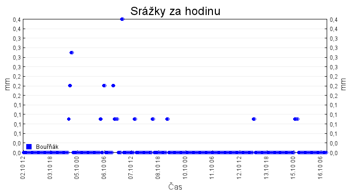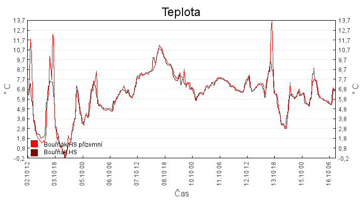 Aktuální hodnoty:Bouřňák HS (850 m): Datum: 16.10.2025 Čas: 09:50:00 Teplota: 5.45 °C Rychlost větru: 3.2 m/s Směr větru: 287.0 ° Radiace: 59.0 W/m2 Srážky 1h: 0.0 mm Srážky 24h: 0.3 mm Bouřňák HS (přízemní teplota) (850 m): Datum: 16.10.2025 Čas: 09:50:57 Teplota: 5.50 °C | Informace z Cínovce: Cínovec Předpověď počasí pro Bouřňák