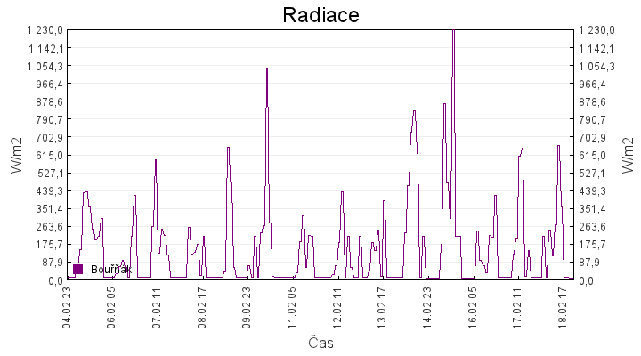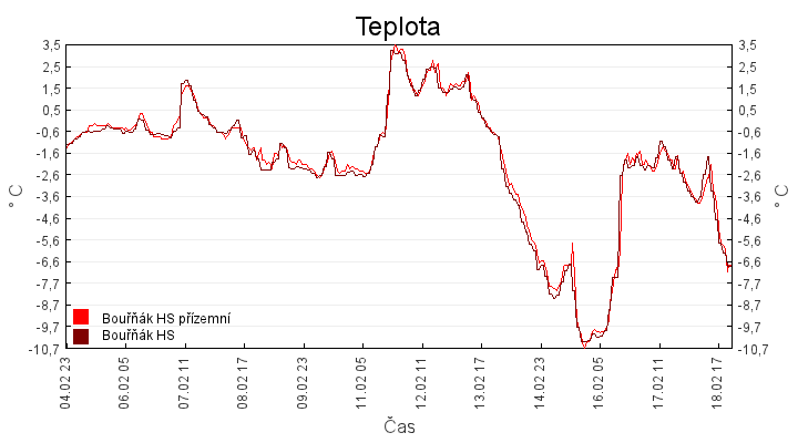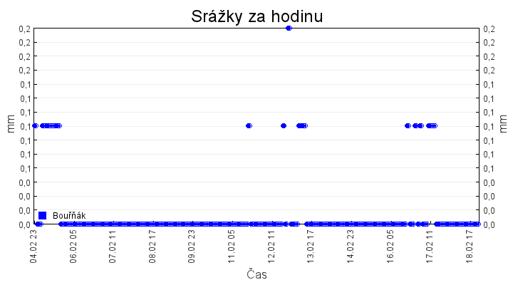 Aktuální hodnoty:Bouřňák HS (850 m): Datum: 18.02.2026 Čas: 22:10:00 Teplota: -7.38 °C Rychlost větru: 1.0 m/s Směr větru: 12.0 ° Radiace: 10.0 W/m2 Srážky 1h: 0.0 mm Srážky 24h: 1.1 mm Bouřňák HS (přízemní teplota) (850 m): Datum: 18.02.2026 Čas: 22:17:28 Teplota: -7.81 °C | Informace z Cínovce: Cínovec Předpověď počasí pro Bouřňák