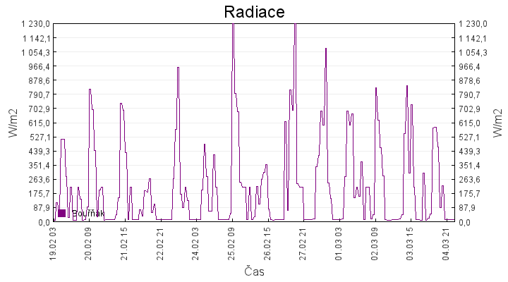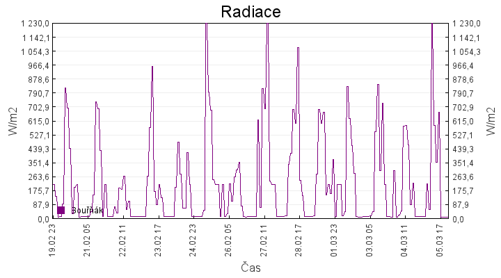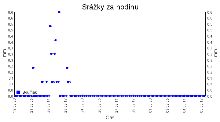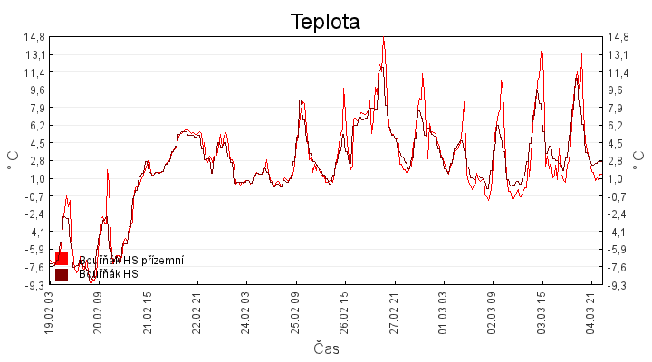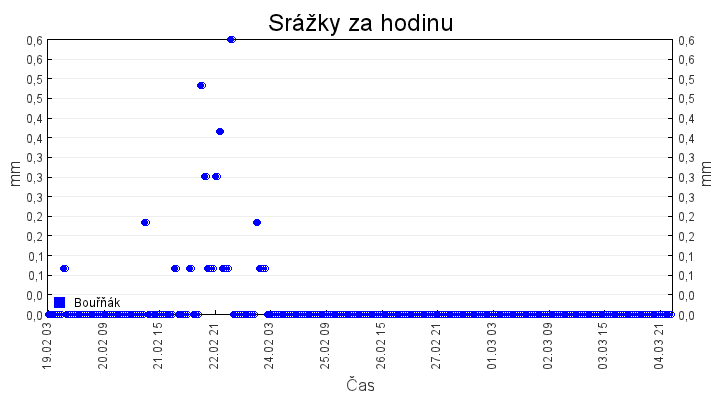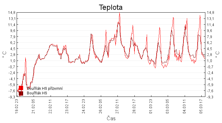 Aktuální hodnoty:Bouřňák HS (850 m): Datum: 05.03.2026 Čas: 02:20:00 Teplota: 2.64 °C Rychlost větru: 0.1 m/s Směr větru: 350.0 ° Radiace: 11.0 W/m2 Srážky 1h: 0.0 mm Srážky 24h: 0.0 mm Bouřňák HS (přízemní teplota) (850 m): Datum: 05.03.2026 Čas: 02:22:44 Teplota: 0.88 °C | Informace z Cínovce: Cínovec Předpověď počasí pro Bouřňák