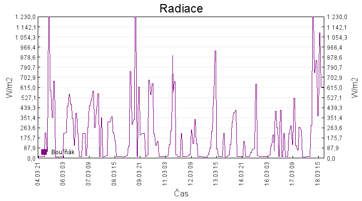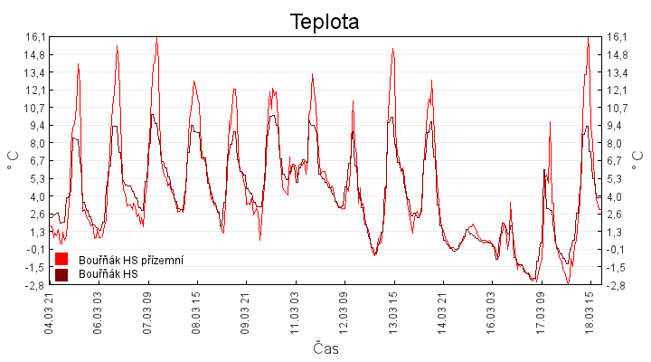 Aktuální hodnoty:Bouřňák HS (850 m): Datum: 18.03.2026 Čas: 19:29:00 Teplota: 4.26 °C Rychlost větru: 2.6 m/s Směr větru: 110.0 ° Radiace: 619.0 W/m2 Srážky 1h: 0.0 mm Srážky 24h: 0.0 mm Bouřňák HS (přízemní teplota) (850 m): Datum: 18.03.2026 Čas: 19:33:36 Teplota: 3.50 °C | Informace z Cínovce: Cínovec Předpověď počasí pro Bouřňák