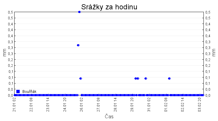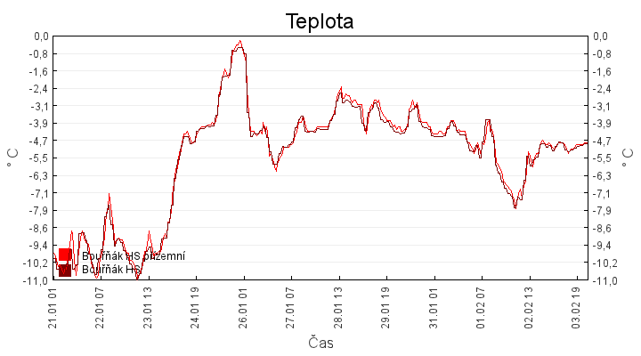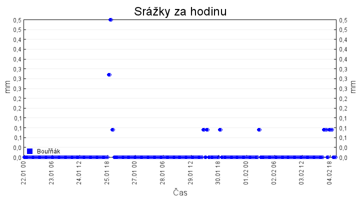 Aktuální hodnoty:Bouřňák HS (850 m): Datum: 04.02.2026 Čas: 22:40:00 Teplota: -1.58 °C Rychlost větru: 0.0 m/s Směr větru: 0.0 ° Radiace: 11.0 W/m2 Srážky 1h: 0.1 mm Srážky 24h: 3.6 mm Bouřňák HS (přízemní teplota) (850 m): Datum: 04.02.2026 Čas: 22:48:31 Teplota: -1.37 °C | Informace z Cínovce: Cínovec Předpověď počasí pro Bouřňák