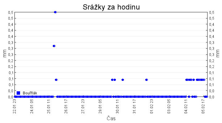 Aktuální hodnoty:Bouřňák HS (850 m): Datum: 05.02.2026 Čas: 22:10:00 Teplota: -0.37 °C Rychlost větru: 1.9 m/s Směr větru: 159.0 ° Radiace: 159.0 W/m2 Srážky 1h: 0.1 mm Srážky 24h: 11.3 mm Bouřňák HS (přízemní teplota) (850 m): Datum: 05.02.2026 Čas: 22:17:03 Teplota: -0.31 °C | Informace z Cínovce: Cínovec Předpověď počasí pro Bouřňák