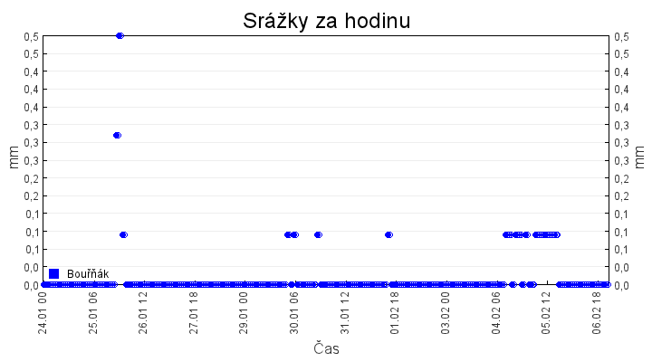 Aktuální hodnoty:Bouřňák HS (850 m): Datum: 06.02.2026 Čas: 22:20:00 Teplota: -0.55 °C Rychlost větru: 0.1 m/s Směr větru: 50.0 ° Radiace: 11.0 W/m2 Srážky 1h: 0.0 mm Srážky 24h: 0.3 mm Bouřňák HS (přízemní teplota) (850 m): Datum: 06.02.2026 Čas: 22:28:00 Teplota: -0.75 °C | Informace z Cínovce: Cínovec Předpověď počasí pro Bouřňák