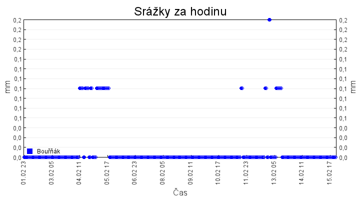 Aktuální hodnoty:Bouřňák HS (850 m): Datum: 15.02.2026 Čas: 22:00:00 Teplota: -10.61 °C Rychlost větru: 0.7 m/s Směr větru: 55.0 ° Radiace: 10.0 W/m2 Srážky 1h: 0.0 mm Srážky 24h: 0.0 mm Bouřňák HS (přízemní teplota) (850 m): Datum: 15.02.2026 Čas: 22:13:38 Teplota: -10.75 °C | Informace z Cínovce: Cínovec Předpověď počasí pro Bouřňák
