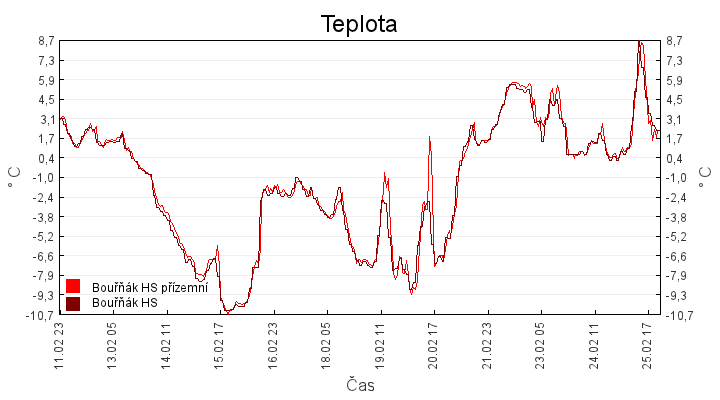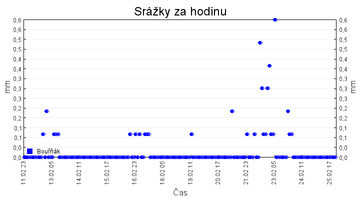 Aktuální hodnoty:Bouřňák HS (850 m): Datum: 25.02.2026 Čas: 21:50:00 Teplota: 2.43 °C Rychlost větru: 1.4 m/s Směr větru: 155.0 ° Radiace: 11.0 W/m2 Srážky 1h: 0.0 mm Srážky 24h: 0.0 mm Bouřňák HS (přízemní teplota) (850 m): Datum: 25.02.2026 Čas: 21:59:07 Teplota: 1.81 °C | Informace z Cínovce: Cínovec Předpověď počasí pro Bouřňák
