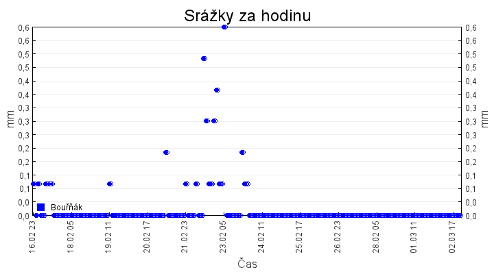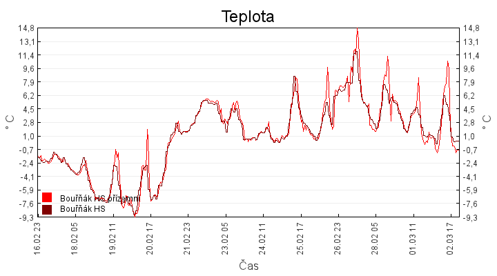Aktuální hodnoty:Bouřňák HS (850 m): Datum: 02.03.2026 Čas: 22:00:00 Teplota: 0.00 °C Rychlost větru: 1.0 m/s Směr větru: 191.0 ° Radiace: 10.0 W/m2 Srážky 1h: 0.0 mm Srážky 24h: 0.0 mm Bouřňák HS (přízemní teplota) (850 m): Datum: 02.03.2026 Čas: 22:02:51 Teplota: -1.12 °C | Informace z Cínovce: Cínovec Předpověď počasí pro Bouřňák