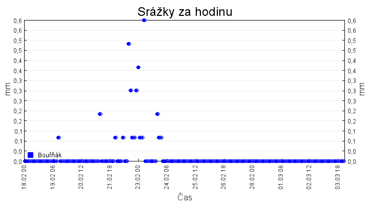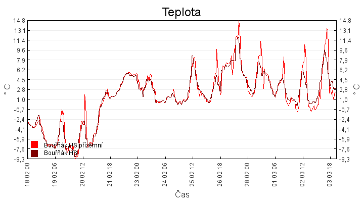 Aktuální hodnoty:Bouřňák HS (850 m): Datum: 03.03.2026 Čas: 22:20:00 Teplota: 2.83 °C Rychlost větru: 0.2 m/s Směr větru: 73.0 ° Radiace: 11.0 W/m2 Srážky 1h: 0.0 mm Srážky 24h: 0.0 mm Bouřňák HS (přízemní teplota) (850 m): Datum: 03.03.2026 Čas: 22:22:48 Teplota: 1.06 °C | Informace z Cínovce: Cínovec Předpověď počasí pro Bouřňák