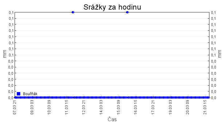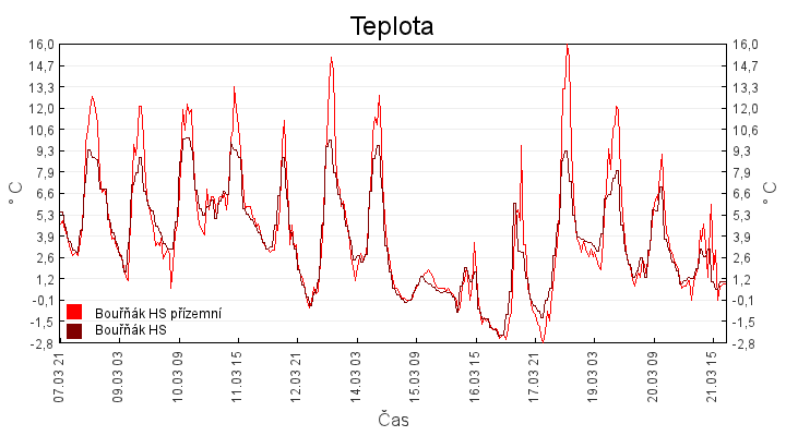 Aktuální hodnoty:Bouřňák HS (850 m): Datum: 21.03.2026 Čas: 19:39:00 Teplota: 1.13 °C Rychlost větru: 1.6 m/s Směr větru: 120.0 ° Radiace: 10.0 W/m2 Srážky 1h: 0.0 mm Srážky 24h: 0.8 mm Bouřňák HS (přízemní teplota) (850 m): Datum: 21.03.2026 Čas: 19:47:26 Teplota: 0.81 °C | Informace z Cínovce: Cínovec Předpověď počasí pro Bouřňák